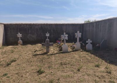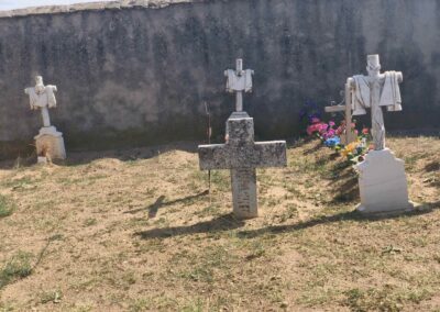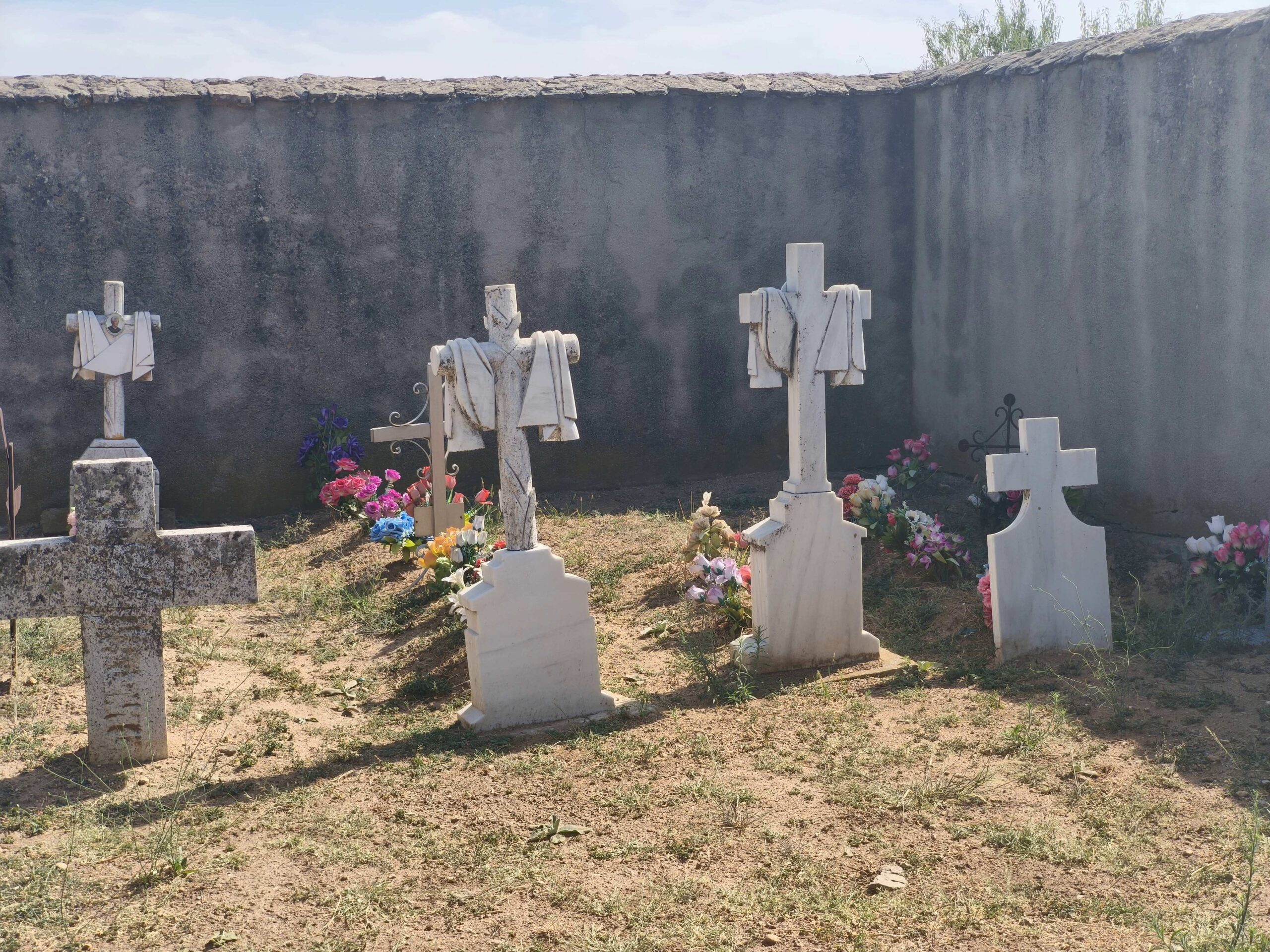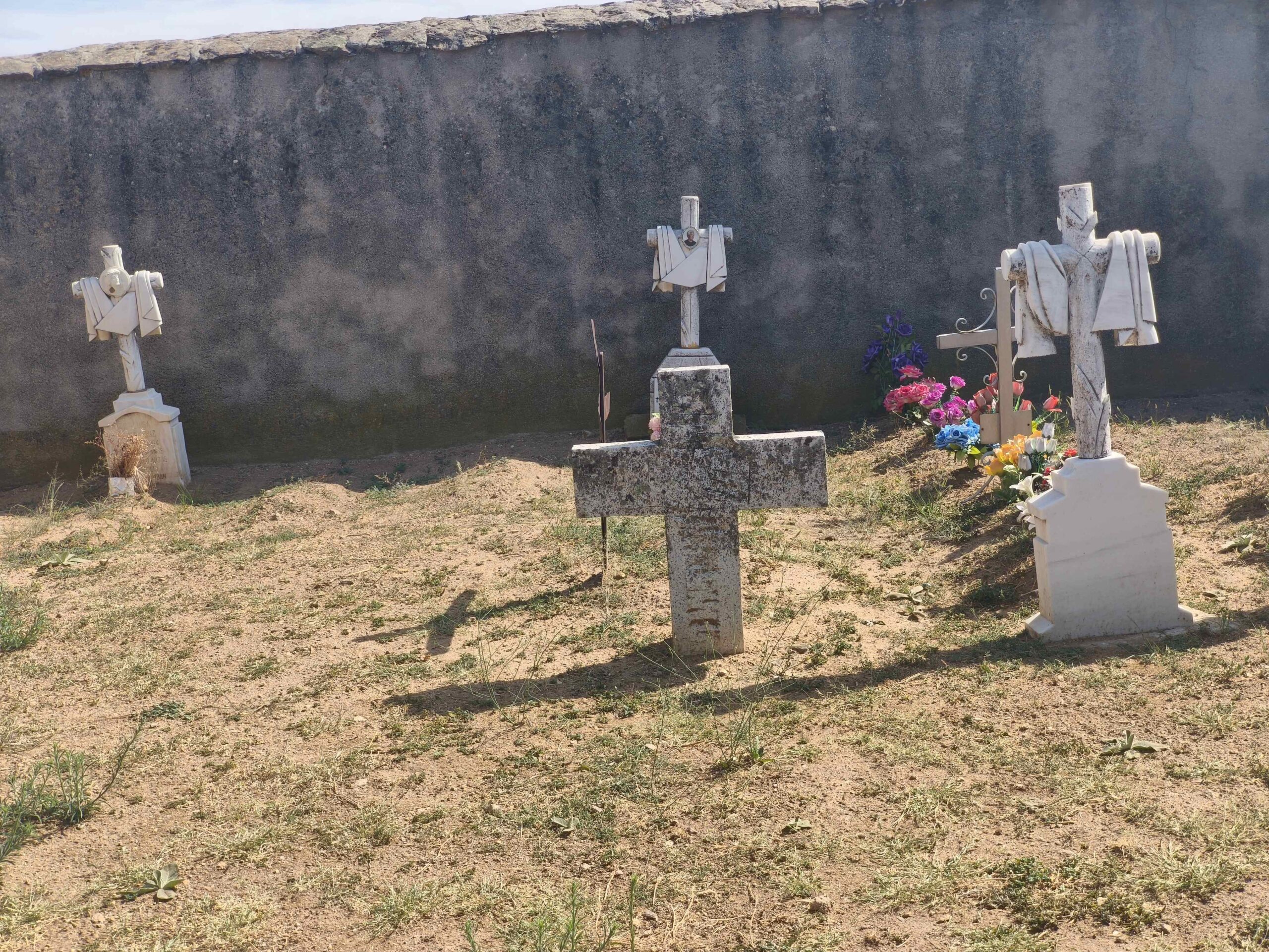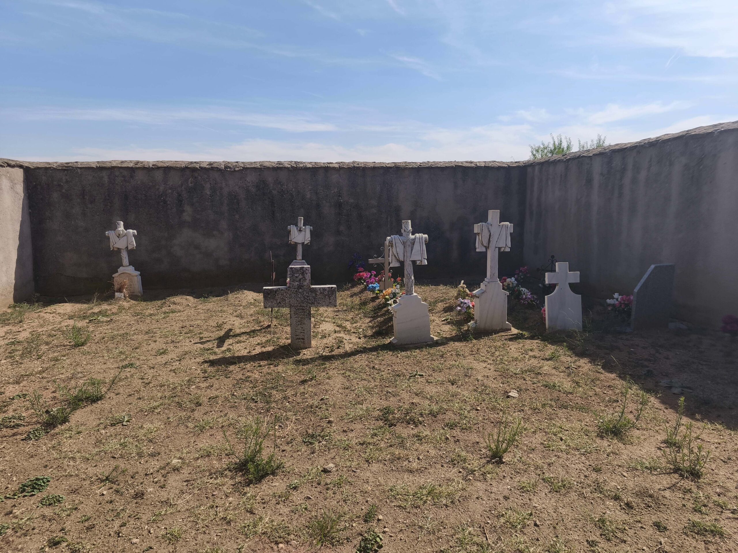 El cementerio de Cinco Villas es un pequeño corral delimitado por un muro de media altura y con puerta de verja que deja ver el interior. En este podemos distinguir actualmente hasta 12 sepulturas, todas de la primera mitad del siglo XX, donde las cruces de mármol era la forma más sencilla de marcar una sepultura sin ocupar mucho espacio, ya que en este cementerio solo hay espacio para 24 cuerpos, pero debido sal sistema de rotación y a la baja mortandad de sus habitantes, el cementerio no necesitaría ninguna ampliación, aunque ya la tiene ejecutada, anexa a este cementerio más antiguo.