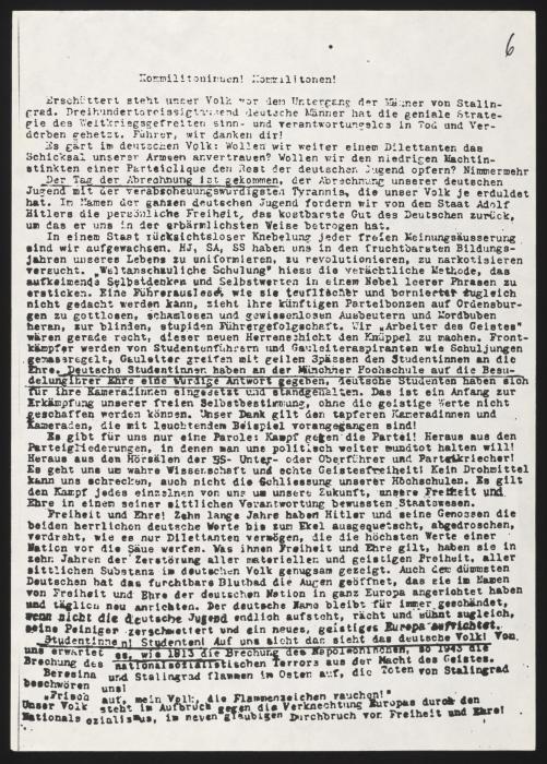 Repartieron 5 números de esta manera. El sexto, fue esparcido por la Universidad por Sophie y su hermano, el 18 de febrero de 1943, pero un miembro del partido nazi les vio y los denunció.